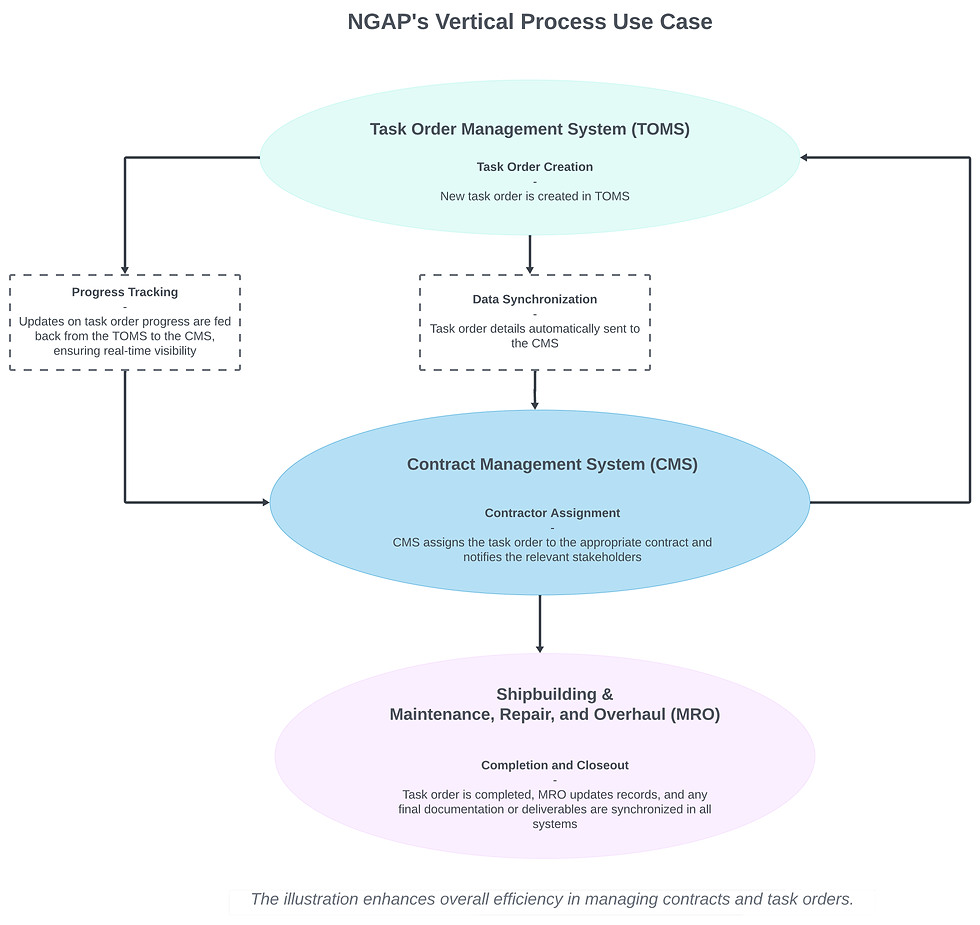 This vertical approach captures all processes with simple mouse clicks and thereby includes contract management, task order management and the details of work package activity. The introduction to the vertical approach to government contracting permits all of these various actions to be visible and actionable to all stakeholders as listed above.